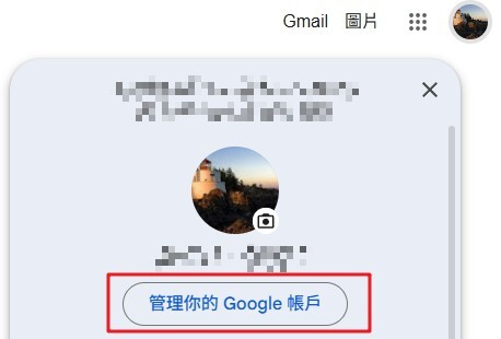 1. 進入 Google 網頁右上角,點選帳戶圖示,點選進入「管理你的 Google 帳戶」。