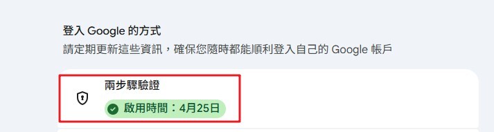 3. 進入後,找到「登入 Google 的方式」區塊,點選進入「兩步驗證」功能選項。