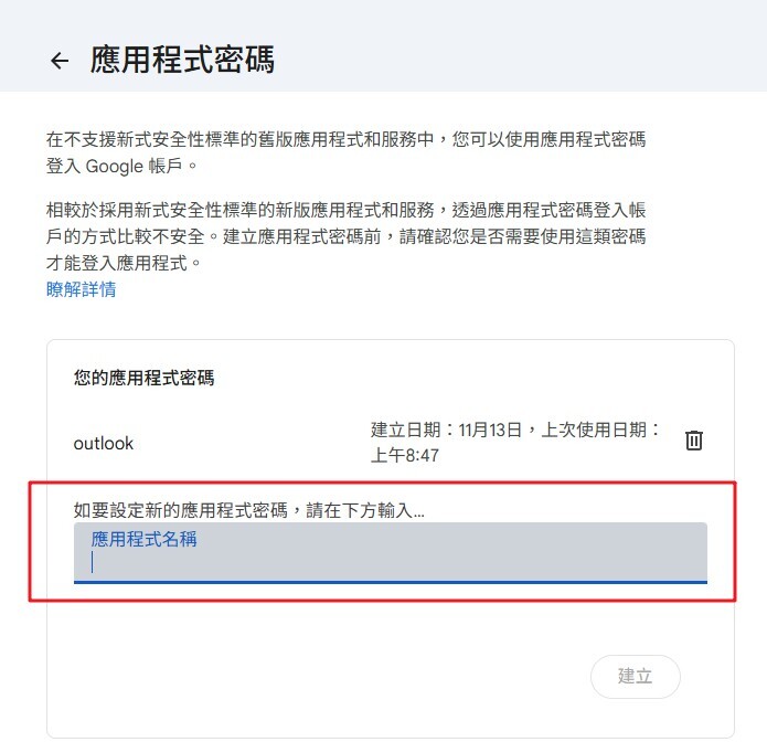 6. 進入「應用程式密碼」功能畫面後,需先新增自訂「應用程式名稱」後,點選「建立」按鈕。