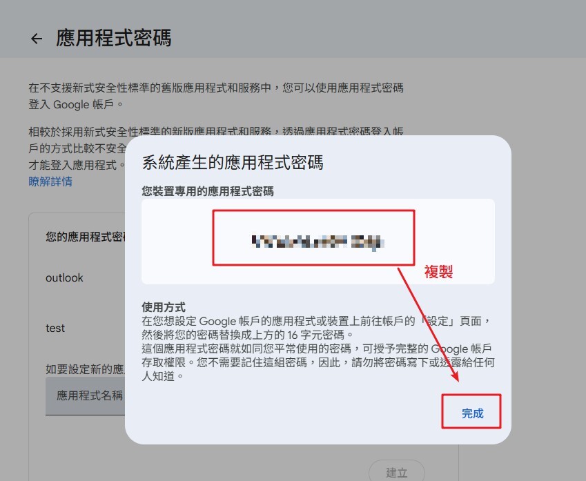 7. 點選完「建立」按鈕後,畫面中會自動產生一組應用程式密碼,請複製密碼後,將密碼貼到 Outlook 密碼,即可正常傳送接收信件。